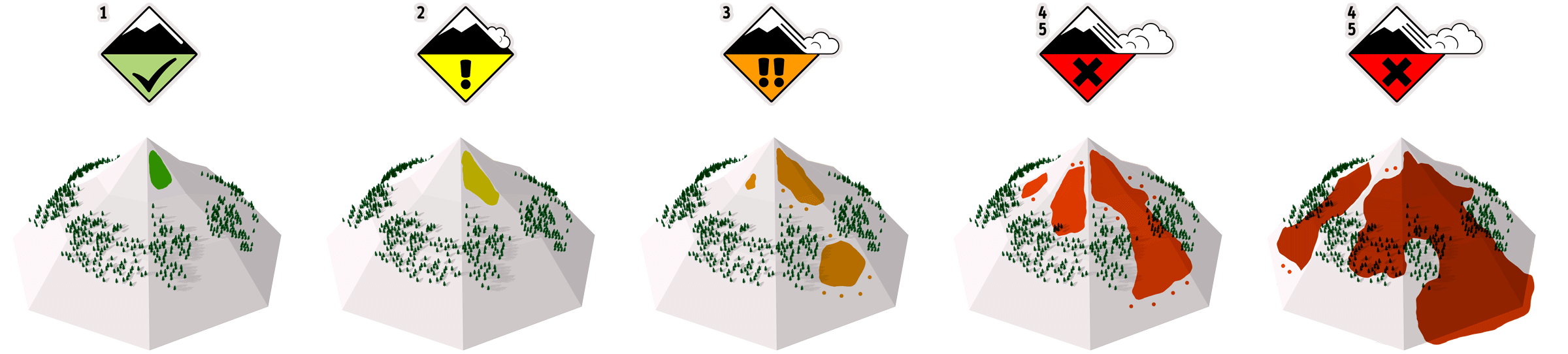 En les següents imatges es mostra la distribució de les zones potencialment perilloses en cadascuna d’aquestes 5 situacions sobre una mateixa porció de terreny. En general, com més elevat és el perill d’allaus més probable és que se'n desencadenin i més notable serà la seva mida.