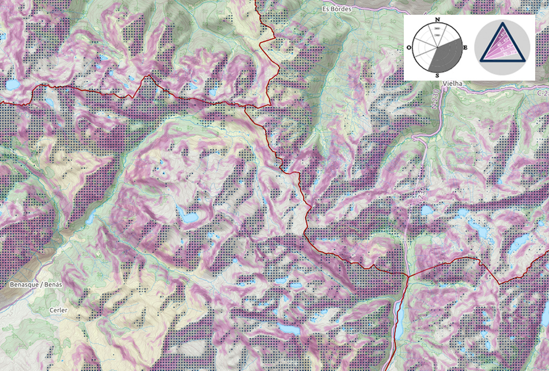 Normalment, la probabilitat de desencadenar una allau i la seva mida no és igual a tot arreu sinó que varia en el temps i segons l’altitud i les orientacions dels vessants. La distribució del perill i dels problemes d’allaus la podem consultar en el BPA del dia. Per fer una bona selecció del terreny en funció d’aquestes condicions, Atesmaps.org ofereix també la possibilitat de seleccionar de forma ràpida en el seu visor determinades orientacions i franges altitudinals, a la vegada que permet consultar el pendent per franges de 5º.