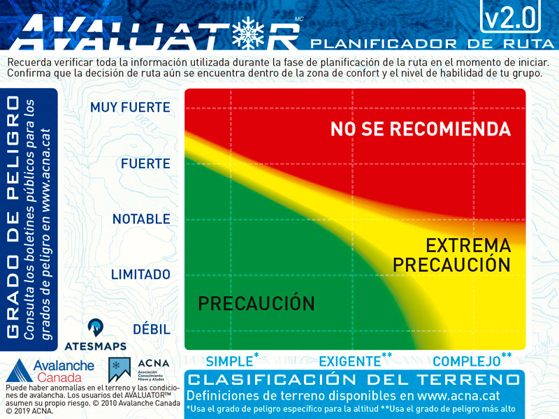L’Avaluador-Planificador de Ruta és una eina de planificació complementària a la Classificació del Terreny d’Allaus que permet als practicants creuar el grau de perill d’allaus del dia amb la classe de terreny ATES d’un itinerari o zona, i obtenir unes recomanacions de seguretat. En aquest procés, l’experiència dels practicants en neu i allaus també es valora. Les tres recomanacions que ens ofereix l’Avaluador són les següents: